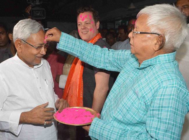 बिहार में मुख्यमंत्री नीतीश कुमार और आरजेडी प्रमुख लालू प्रसाद ने भी एक-दूसरे को गुलाल का टीका लगाकर होली की बधाई दी.