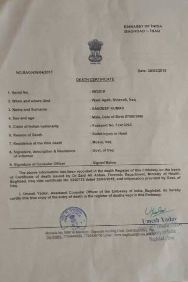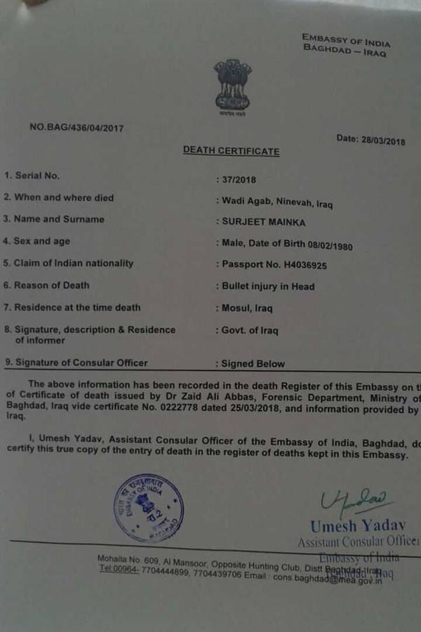 पहले खबर यह थी कि मोसुल पर कब्जा हटने के बाद आतंकी इन अगवा भारतीयों को अपने साथ बद्दूस ले गए थे. वहां पर इनको जेल में बंद कर दिया था. उसी दौरान जेल पर हमला हुआ था और उसमें इन की मौत हो गई. हालांकि डेथ सर्टिफिकेट के अनुसार इन भारतीय मजदूरों 2014 में ही बहुत नजदीक से यानी कि सर पर गोली मारी गई थी, जिससे इनकी मौत हुई.