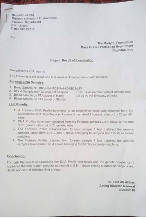 बलवंत राय और हेमराज के DNA और फॉरेंसिक जांच की जो फाइनल रिपोर्ट है, वह साफ कहती है कि दोनों की मौत 2014 में ही सर पर गोली मारकर हुई है. गौरतलब है कि भारत सरकार ने 2017 में अगवा सभी भारतीयों के परिजनों के डीएनए सैंपल लिए थे. मार्च 2018 में भारतीय दूतावास के माध्यम से इन सैंपलों को इराक सरकार को सौंपा गया था और बद्दूस में मिले शवों के साथ इनका DNA मैच किया गया था. अब यह भी साफ हो गया है की ISIS ने इन अगवा भारतीयों को नजदीक से गोली मारी थी.
