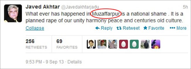 जावेद अख्तर भी इस वारदात से काफी दुखी हैं और उन्होंने इसकी तुलना रेप से की है. उन्होंने अपना गुस्सा जाहिर करने के लिए ट्विटर को चुना, लेकिन उनसे एक गलती हो गई. उन्होंने अपने ट्वीट में मुजफ्फरनगर को मुजफ्फरपुर लिख दिया.