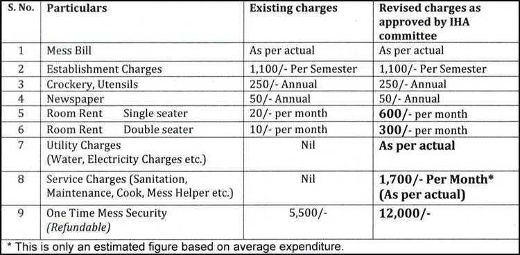 वहीं हॉस्टल में पहले छात्रों को कभी सर्विस चार्ज या यूटिलिटी चार्जेज जैसे कि पानी और बिजली के पैसे नहीं देने होते थे. जेएनयू प्रशासन की ओर से इसमें भी बढ़ोत्तरी की गई थी. यूटिलिटी चार्जेज के तौर पर (एज पर एक्चुअल) यानी इस्तेमाल के अनुसार बिल का प्रावधान कर दिया गया था. जिसके अनुसार स्टूडेंट्स को इस्तेमाल के हिसाब से इसका खर्च देना पड़ता, वहीं सर्विस चार्जेज के तौर आईएचए कमेटी ने 1700 रुपये महीने फीस जोड़ दी थी, ये एकदम नई मद थी. प्रति महीने इतनी रकम हर छात्र को देनी पड़ती. इसके अलावा प्रशासन ने वन टाइम मेस सिक्योरिटी जो कि पहले 5500 रुपये थी, इसे भी 200 पर्सेंट से ज्यादा बढ़ाकर 12000 रुपये किया गया था.