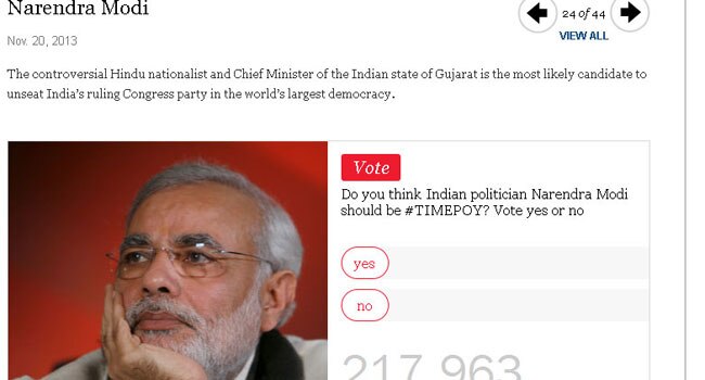 साप्ताहिक समाचार पत्रिका ने कहा, ‘भारतीय प्रधानमंत्री नरेंद्र मोदी ‘टाइम पर्सन ऑफ द ईयर’ सर्वेक्षण में आगे निकल गए हैं, उन्होंने फर्ग्यूसन के प्रदर्शनकारियों को पछाड़ दिया है. मतदान को सिर्फ चार दिन बचे हैं.’ पत्रिका ने कहा था कि मंगलवार तक मोदी को 10.8 प्रतिशत वोट मिले थे जबकि फर्ग्यूसन के प्रदर्शनकारियों को 10.2 प्रतिशत वोट मिले थे. मोदी की बढ़त कल मजबूत होकर 12.8 प्रतिशत पर पहुंच गई. इबोला का इलाज कर रहे डॉक्टरों और नर्सों ने 4.5 प्रतिशत वोट के साथ पांचवां स्थान प्राप्त कर लिया है और वे रूस के राष्ट्रपति व्लादिमीर पुतिन से आगे निकल गए हैं. पुतिन को 4.1 प्रतिशत वोट मिले हैं.