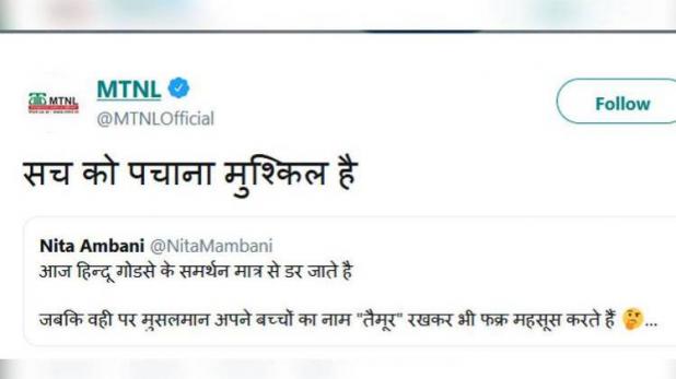 एक ट्विटर यूजर ने लिखा, ‘आज हिंदू गोडसे के समर्थन मात्र से डर जाते हैं, जबकि मुसलमान अपने बच्चों का नाम तैमूर रख फक्र करते हैं’. सोशल मीडिया पर इसपर कड़ी प्रतिक्रियाएं आ रही हैं और लोग MTNL को ही ट्रोल कर रहे हैं. ये ट्वीट गुरुवार सुबह 11.43 बजे किया गया था.