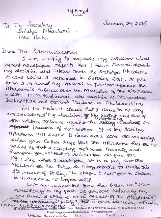 अकादमी ने इन 40 लेखकों को चिट्ठी भेजकर बताया था कि वह पुरस्कार वापस नहीं ले सकती. इसके बाद खबर आई कि नयनतारा सहगल सहित 11 लेखकों ने अपनी रजामंदी अकादमी को भेज दी है. सहगल पुरस्कार लौटाने वाले शुरुआती लेखकों में थीं.