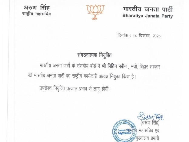 यह नियुक्ति 14 दिसंबर 2025 से तत्काल प्रभाव से लागू हो गई है. इस संबंध में पार्टी की ओर से औपचारिक संगठनात्मक आदेश जारी किया गया है. बीजेपी के राष्ट्रीय महासचिव एवं मुख्यालय प्रभारी अरुण सिंह द्वारा जारी आदेश के अनुसार, यह नियुक्ति भारतीय जनता पार्टी के संसदीय बोर्ड द्वारा की गई है. आदेश में स्पष्ट किया गया है कि नितिन नबीन, जो वर्तमान में बिहार सरकार में मंत्री हैं, अब राष्ट्रीय स्तर पर संगठन की महत्वपूर्ण जिम्मेदारी संभालेंगे.