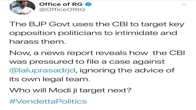 राहुल ने ट्वीट कर कहा कि बीजेपी सरकार सीबीआई का इस्तेमाल विपक्षी पार्टियों के प्रमुख नेताओं को टारगेट करने और उनको परेशान करने के लिए कर रही है. अब एक न्यूज रिपोर्ट भी इस ओर इशारा कर रही है कि सीबीआई पर लालू यादव के खिलाफ केस दर्ज करने का दबाव बनाया गया, जबकि सीबीआई की खुद की कानूनी टीम ने ऐसा न करने की सलाह दी थी.
