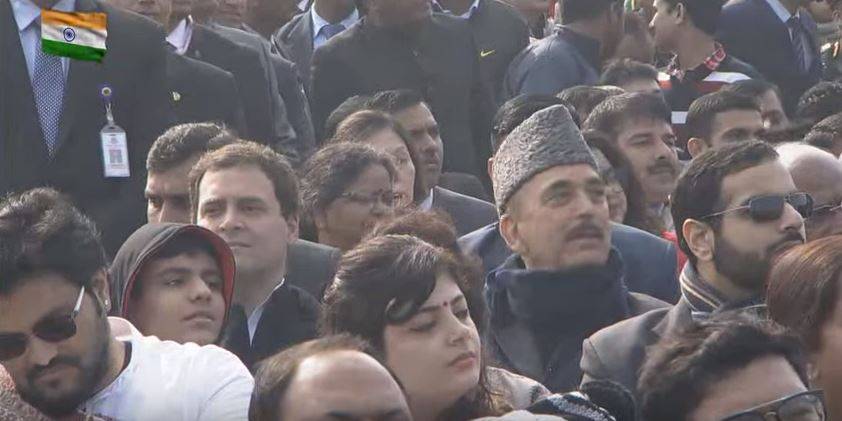 देश 69वां गणतंत्र दिवस मना रहा है. कांग्रेस अध्यक्ष राहुल गांधी राजपथ पर गणतंत्र दिवस समारोह में शामिल हुए. वो चौथी पंक्ति में कांग्रेस नेता गुलाम नबी आजाद के बगल में बैठे नजर आए. जबकि केंद्रीय मंत्री स्मृति ईरानी उनसे दो पंक्ति आगे बैठी दिखीं. वहीं बीजेपी अध्यक्ष पहली पंक्ति में बैठे थे.