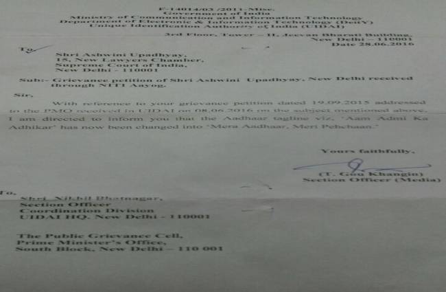 यूनिक आइडेंटिफिकेशन अथॉरिटी ऑफ इंडिया (UIDAI) ने इस संबंध में वकील और बीजेपी नेता अश्विनी उपाध्याय को चिट्ठी लिखी है. 28 जून को लिखी इस चिट्ठी में कहा गया है कि आधार कार्ड की टैगलाइन को बदल दिया गया है. अश्विनी कुमार ने टैगलाइन बदलने के लिए PMO को याचिका दी थी.