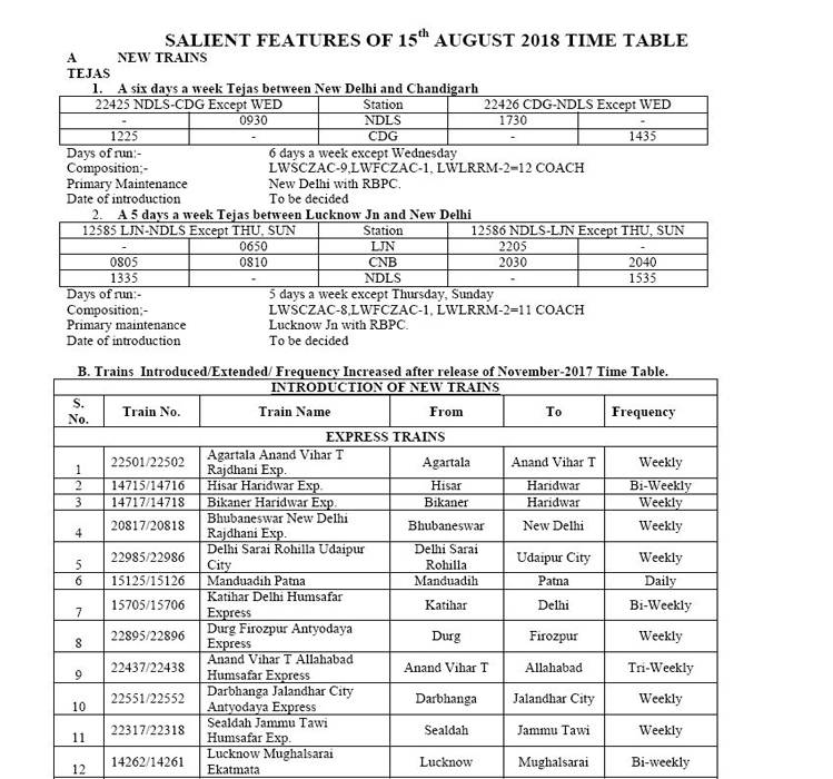 भारतीय रेलवे ने साल 2018-19 के लिए नए टाइम टेबल का ऐलान कर दिया है और यह 15 अगस्त से लागू होगा. उत्तर रेलवे ने इसकी घोषणा करते हुए ऐलान किया कि नए टाइम टेबल के मुताबिक गाड़ियों के प्रस्थान और आगमन समय में बदलाव किया गया है.