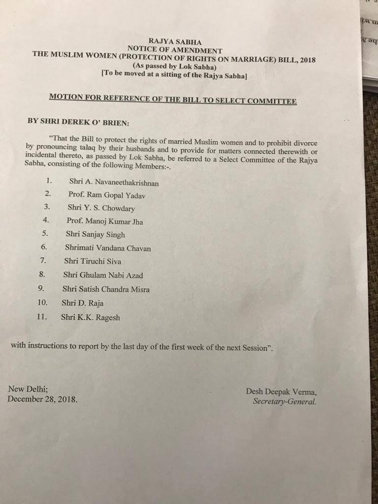 केन्द्र सरकार के लिए बड़ा झटका ये भी है कि इन 12 दलों में तमिलनाडु की AIADMK भी शामिल है. जो अभी तक मोदी सरकार के समर्थन में मानी जा रही थी. नियमों के मुताबिक, तीन तलाक बिल पर राज्यसभा में चर्चा से पहले चेयरमैन इस प्रस्ताव की जानकारी सदन को देंगे.