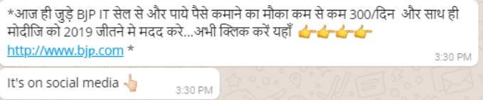 बीजेपी और प्रधानमंत्री नरेन्द्र मोदी के समर्थकों की संख्या तो करोड़ों में होगी, लेकिन अगर किसी बीजेपी के समर्थक को सीधे बीजेपी आईटी सेल का हिस्सा बनने का मौका मिले और साथ में 300 रुपए हर दिन की कमाई भी हो तो ऐसा मौका कौन चूकना चाहेगा. आजकल सोशल मीडिया पर वायरल हो रहा एक मैसेज ठीक यही दावा कर रहा है. दावा भी सीधे ''BJP की वेबसाइट'' में किया जा रहा है जिसमें कहा जा रहा है कि आप न सिर्फ नरेंद्र मोदी को 2019 में जीतेने में मदद भी कर सकते हैं, बल्कि साथ में हर दिन कम से कम 300 रुपए भी कमा सकते हैं. मैसेज के आखिर में दिए गए लिंक पर क्लिक करने को भी कहा गया है.