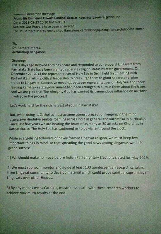 चिट्ठी के मुताबिक कैथोलिक चर्च और कर्नाटक में सत्तारूढ़ कांग्रेस सरकार ने लिंगायत को अलग अल्पसंख्यक धर्म बनाने के लिए गुपचुप ढंग से मिलकर काम किया. चिट्ठी में एक कथित रोडमैप का दावा भी किया गया है जिसके मुताबिक लिंगायत समुदाय को पहले हिंदुओं से अलग करना और फिर उनका कैथोलिक ईसाई के रूप में धर्म परिवर्तन कराना था.