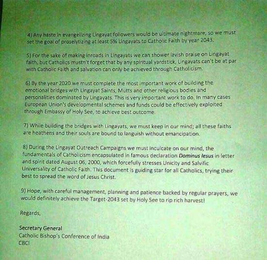 चिट्ठी में ये भी कहा गया है, 'कर्नाटक में आत्माओं की समृद्ध फसल के लिए हमें कड़ी मेहनत करनी चाहिए.' चिट्ठी में आगे कहा गया है, 'लिंगायत में पैठ बनाने के लिए हम लिंगायत आस्था की खूब प्रशंसा कर सकते हैं लेकिन कैथोलिक को ये कभी नहीं भूलना चाहिए कि किसी भी आध्यात्मिक मापदंड के मुताबिक लिंगायत कैथोलिक आस्था के बराबर नहीं हो सकते और मोक्ष सिर्फ कैथोलिक होने से ही मिल सकता है.'