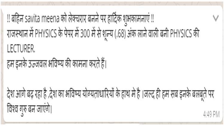 सोशल मीडिया पर ये खबर खूब फैली हुई है कि राजस्थान में सविता मीणा नाम की एक लड़की फिजिक्स में तीन सौ में से 0.68 नंबर, यानि एक से भी कम नंबर लाकर लेक्चरार बन गयी है. यही नहीं, इन खबरों के मुताबिक, सविता सिर्फ फिजिक्स में ही शून्य नंबर नहीं लायी थी, बल्कि जनरल स्टडीज में भी उसे कुल सोलह नंबर आए थे. लोग न सिर्फ इस खबर को खूब शेयर कर रहे हैं, बल्कि इसपर चटखारे भी ले रहे हैं. जैसे किसी ने लिखा -