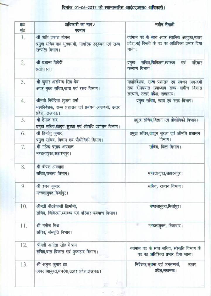 उत्तर प्रदेश में एक बार फिर प्रशासनिक फेरबदल हुआ है. गुरुवार को जारी नई लिस्ट में 20 आईएएस अधिकारियों के तबादले किए गए हैं. नई लिस्ट में दीपक अग्रवाल राजस्व विभाग के सचिव पद से हटाकर सहारनपुर का नया मण्डलायुक्त बनाया गया है.