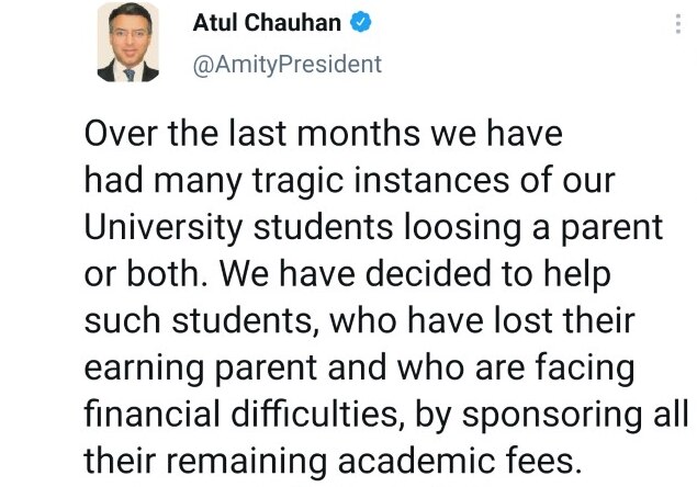 एमिटी विश्वविद्यालय के चांसलर डा अतुल चौहान ने इस सर्दंभ में जानकारी देते हुए कहा है पिछले कुछ सप्ताह से हमें कोरोना से कई छात्रों के माता- पिता के देहांत की दुखद खबरें प्राप्त हो रही हैं. एमिटी विश्वविद्यालय सदैव से अपने छात्रों को भावनात्मक सहयोग प्रदान करता रहा है और इसी क्रम में एक कदम और बढ़ाते हुए एमिटी विश्वविद्यालय द्वारा अभिभावक या दोनो अभिभावकों (जो शिक्षण हेतु फीस की सहायता करते थे) खो चुके छात्रों की बाकी पूर्ण अकादमिक फीस का वहन करने का फैसला हुआ है.
