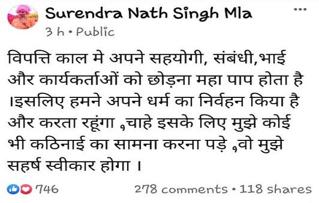 बलिया गोलीकांड पर भारतीय जनता पार्टी (बीजेपी) विधायक सुरेंद्र सिंह के बयान से पार्टी हाईकमान नाराज हैं. लेकिन ऐसा लगता है कि बीजेपी विधायक को इससे कोई फर्क ही नहीं पड़ता है. कारण बताओ नोटिस मिलने के बाद भी बीजेपी विधायक के तेवर बरकरार हैं. उन्होंने अपने फेसबुक अकाउंट पर एक पोस्ट डाला है. जिसमें उन्होंने लिखा है कि विपत्ति काल में अपने भाई और कार्यकर्ताओं को छोड़ना महापाप होता है. इसलिए हमने अपने धर्म का निर्वहन किया है और करता रहूंगा. चाहे इसके लिए मुझे कोई भी कठिनाई का सामना करना पड़े, वो मुझे सहर्ष स्वीकार होगा.