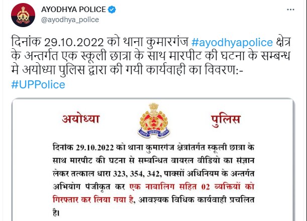 मामले की जानकारी देते हुए अयोध्या पुलिस ने रविवार को ट्वीट किया. जिसमें बताया गया, '29 अक्टूबर को थाना कुमारगंज क्षेत्र के अंतर्गत स्कूली छात्रा के साथ मारपीट की घटना से संबंधित वायरल वीडियो का संज्ञान लेते हुए तत्काल सुसंगत धाराओं में केस दर्ज किया गया है. आरोपियों पर धारा 323, 354, 342, पॉक्सो अधिनियम के अन्तर्गत अभियोग पंजीकृत कर एक नाबालिक सहित दो व्यक्तियों को गिरफ्तार किया गया है. आवश्यक विधिक कार्रवाई प्रचलित है.'