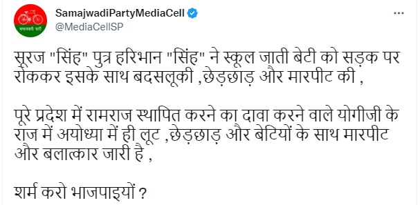 वीडियो वायरल होने के बाद समाजवादी पार्टी के मीडिया सेल के ऑफिशियल ट्विटर हैंडल से ट्वीट करते हुए लिखा गया, स्कूल जाती बेटी को सड़क पर रोककर इसके साथ बदसलूकी, छेड़छाड़ और मारपीट की. पूरे प्रदेश में रामराज स्थापित करने का दावा करने वाले योगीजी के राज में अयोध्या में ही लूट, छेड़छाड़ और बेटियों के साथ मारपीट और बलात्कार जारी है.शर्म करो भाजपाइयों?"