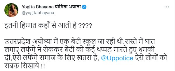 महिलाओं के लिए आवाज उठाने वाली एक्टिविस्ट योगिता भयाना ने ट्वीट कर लिखा, "इतनी हिम्मत कहाँ से आती है ???? उत्तरप्रदेश अयोध्या में एक बेटी स्कूल जा रही थी, रास्ते में घात लगाए लफंगे ने रोककर बेटी को कई थप्पड़ मारते हुए धमकी दी. ऐसे लफेंगे समाज के लिए खतरा है. यूपी पुलिस ऐसे लोगों को सबक सिखाए!!"