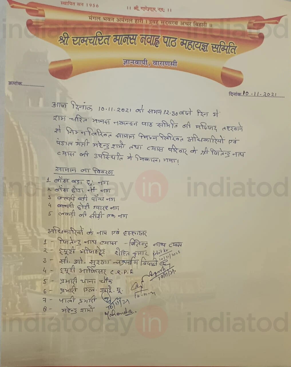 रामचरितमानस नवाह पाठ महायज्ञ समिति हर साल ज्ञानवापी परिसर में रामचरितमानस का पाठ कराती है और यही संस्था इस तहखाने का इस्तेमाल बांस बल्ली और टेंट का सामान पाठ के दौरान रखने के लिए करती रही है. इस संस्था ने कितना सामान अंदर रखा था, उसकी पूरी लिस्ट दी है.