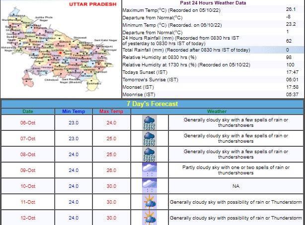 मौसम विभाग के मुताबिक, विजयदशमी के दिन हुई भारी बरसात के बाद से ही यूपी में बारिश थमने वाली नहीं है. मौसम विभाग का पूर्वानुमान है कि ये सिलसिला अभी 08 अक्टूबर तक जारी रह सकता है. मौसम विभाग की मानें तो 09 अक्टूबर को बारिश से राहत मिलेगी. इस दौरान मौसम विभाग ने प्रदेश में अलर्ट जारी किया है. IMD की चेतावनी के मुताबिक, उत्तर प्रदेश में कहीं अधिक तो कहीं अत्याधिक बारिश के आसार बन रहे हैं.
