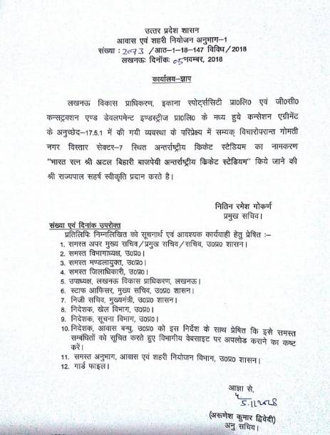अब यह मैच ऑफिशियल भारत रत्न श्री अटल बिहारी वाजपेयी इंटरनेशनल क्रिकेट स्टेडियम में खेला जाएगा. इस नए नाम को यूपी के राज्यपाल राम नाईक ने भी अनुमति दे दी है. बता दें कि इसी साल 16 अगस्त को अटल बिहारी वाजपेयी का देहांत हो गया था.