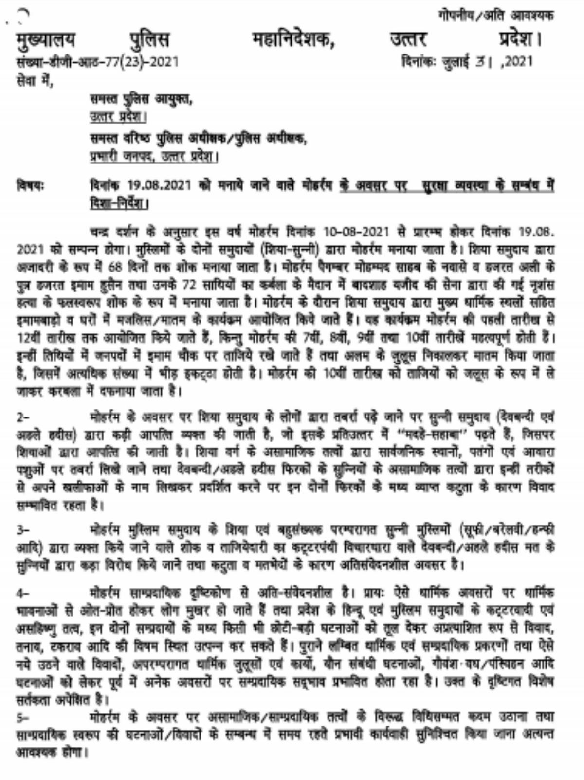 मुहर्रम को लेकर उत्तर प्रदेश में एक सर्कुलर जारी हुआ है. इसमें यूपी में इस साल मुहर्रम पर जुलूस नहीं निकालने का निर्देश दिया गया है. गाइडलाइंस या सर्कुलर (Muharram 2021 Uttar Pradesh guidelines) सामने आने के बाद अब इनपर हंगामा शुरू हो गया है. शिया धर्मगुरु गाइडलाइंस में लिखी बातों पर आपत्ति जता रहे हैं. वहीं यूपी पुलिस का कहना है कि जारी सर्कुलर में कुछ विवादित या नया नहीं जोड़ा गया है.