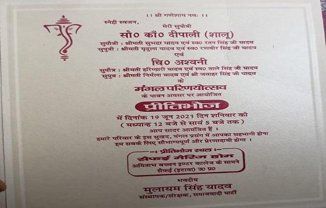 19 और 20 तारीख को मुलायम सिंह का पूरा परिवार एक मंच पर एक साथ दिखाई देगा. हालांकि महामारी के कारण शादी में कम लोगों को निमंत्रण दिया गया है, लेकिन कुछ बड़े नेताओं के शामिल होने की उम्मीद है. चर्चा है कि वैवाहिक समारोह में नेताओं के साथ अन्य हस्तियां भी शामिल हो सकती हैं.