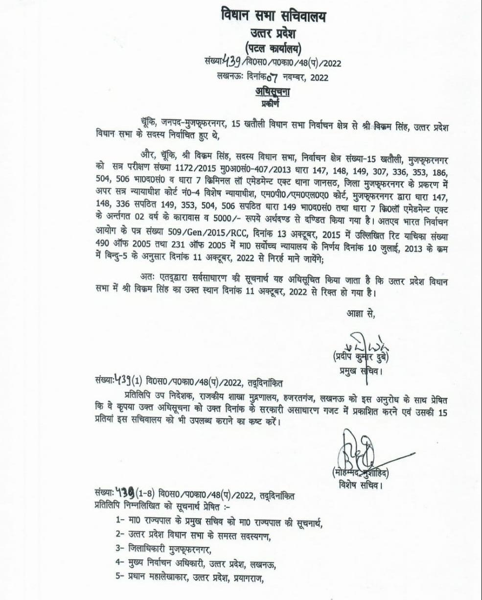 समाजवादी पार्टी के वरिष्ठ नेता आजम खान के बाद अब यूपी के एक और विधायक की सदस्यता जाने के बाद सीट खाली हुई है. दरअसल, बीजेपी विधायक विक्रम सिंह सैनी की सदस्यता जाने के बाद मुजफ्फरनगर जिले की खतौली विधानसभा सीट खाली हो गई है. विधानसभा सचिवालय की तरफ से सोमवार देर शाम इसके लिए सूचना भी जारी कर दी गई है. विधानसभा प्रमुख सचिव प्रदीप कुमार दुबे द्वारा जारी किए आदेश में कहा गया है कि 15 खतौली विभानसभा निर्वाचन क्षेत्र से विक्रम सिंह निर्वाचित हुए थे. उन्हें मुजफ्फरनगर दंगे में दोषी पाए जाने पर एमपीएमएल कोर्ट द्वारा दो साल की सजा सुनाई गई है. इसके बाद से ही विक्रम सैनी की विधानसभा की सदस्यता को रद्द कर दिया गया है. जिसके चलते 11 अक्टूबर 2022 से उत्तर प्रदेश विधानसभा में विक्रम सिंह का स्थान रिक्त हो गया है.