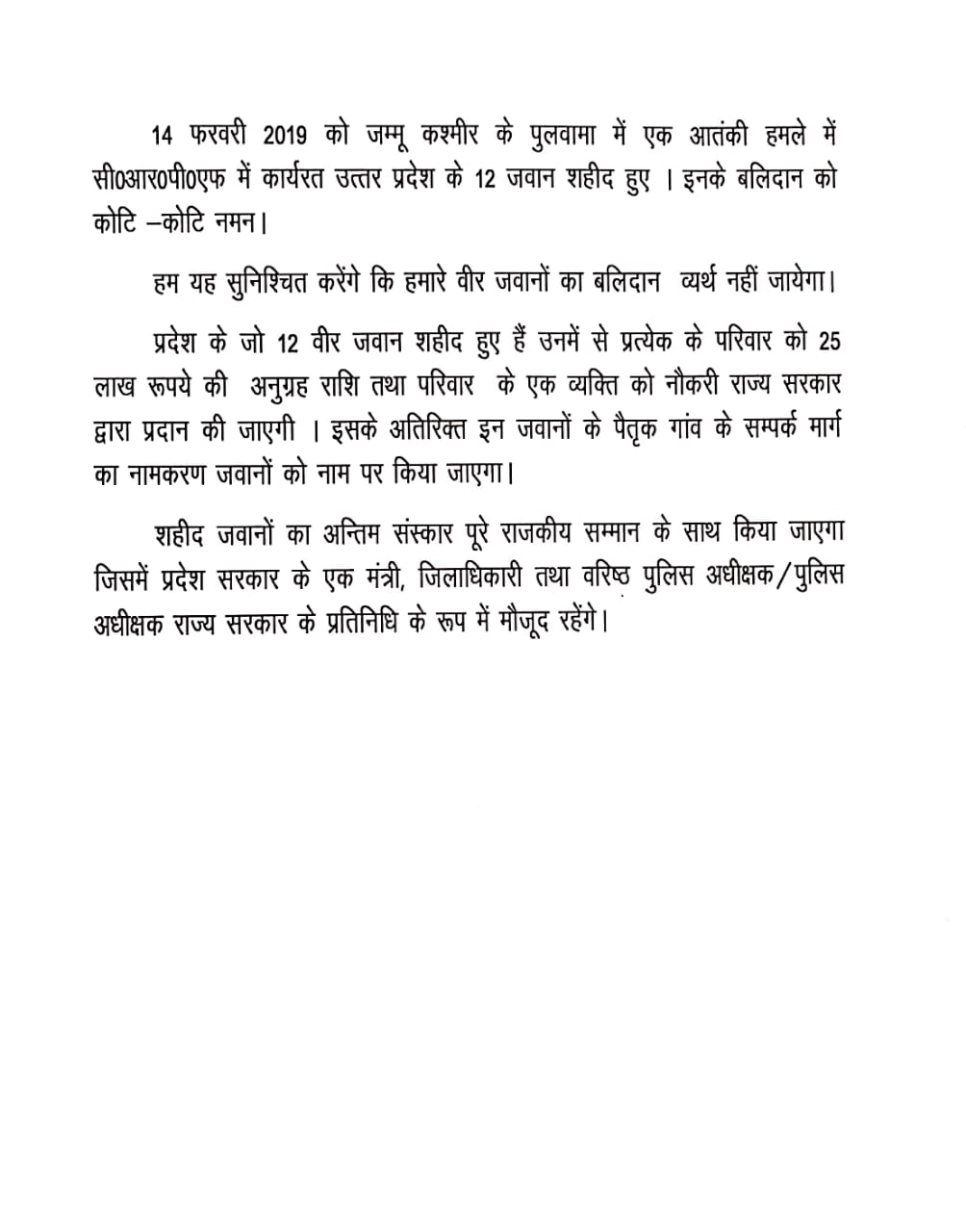 उत्तर प्रदेश के मुख्यमंत्री योगी आदित्यनाथ ने पुलवामा हमले में शहीद हुए उत्तर प्रदेश के जवानों के परिजनों के लिए 25 लाख रुपये की राशि देने का ऐलान किया है.