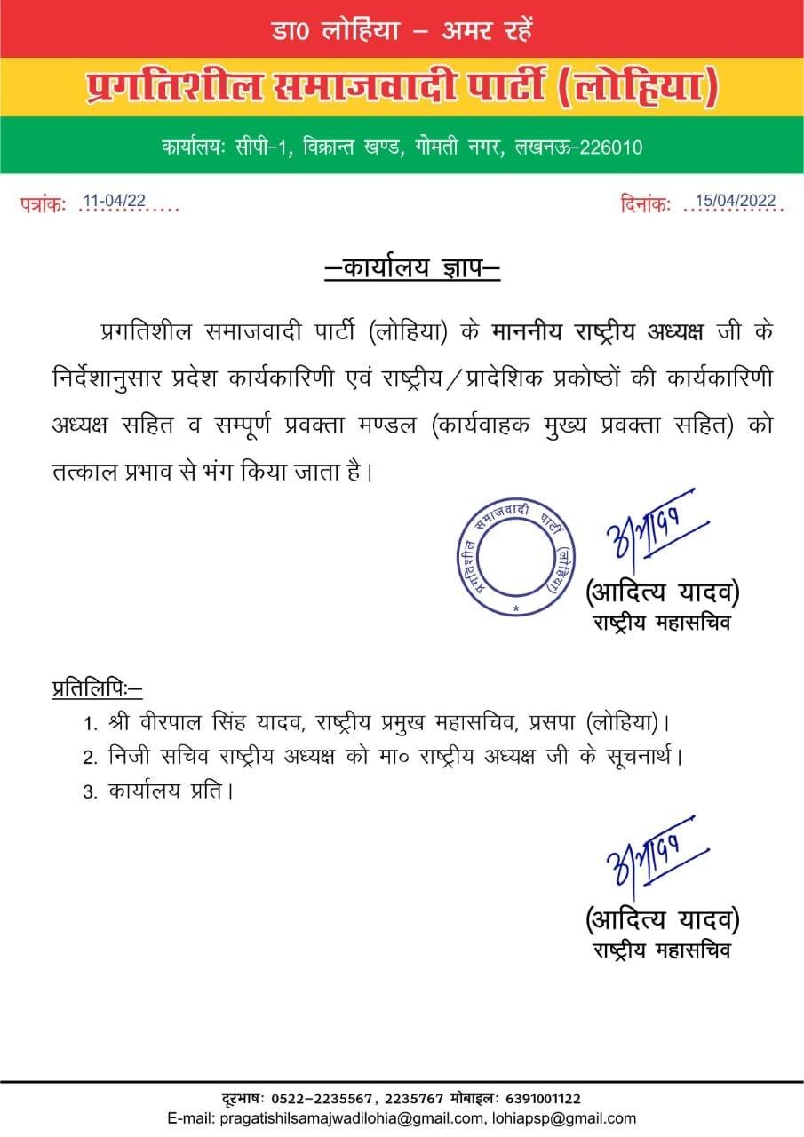 पार्टी अध्यक्ष शिवपाल यादव के आदेश पर सभी कमेटियों को भंग कर दिया गया है. इसके लिए पार्टी ने एक पत्र जारी किया है. इसमें कहा गया है कि प्रगतिशील समाजवादी पार्टी (लोहिया) के अध्यक्ष शिवपाल यादव के निर्देशानुसार प्रदेश कार्याकरिणी और राष्ट्रीय/प्रादेशिक प्रकोष्ठों की कार्यकारिणी के साथ ही प्रवक्ता मंडल को तत्काल प्रभाव से भंग किया जाता है.