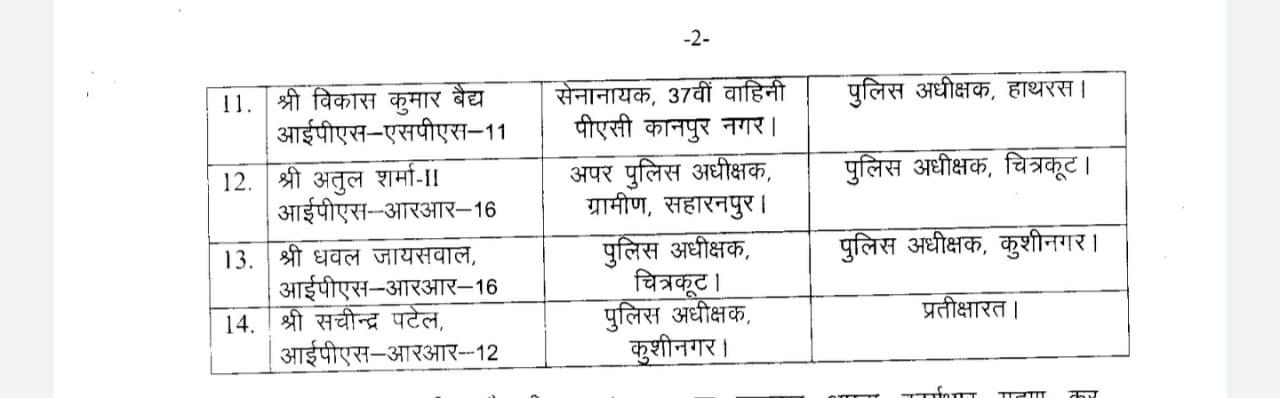 उत्तर प्रदेश की योगी सरकार ने गुरुवार-शुक्रवार की रात भारतीय पुलिस सेवा (IPS) के करीब एक दर्जन अफसरों के तबादले कर दिए. आईपीएस विकास वैद्य को हाथरस तो अतुल शर्मा को चित्रकूट का पुलिस अधीक्षक (SP) नियुक्त किया गया है. वहीं, बलरामपुर के एसपी हेमंत कुटियाल को वरिष्ठ पुलिस अधीक्षक (SSP) बनाकर मुरादाबाद भेजा गया है.