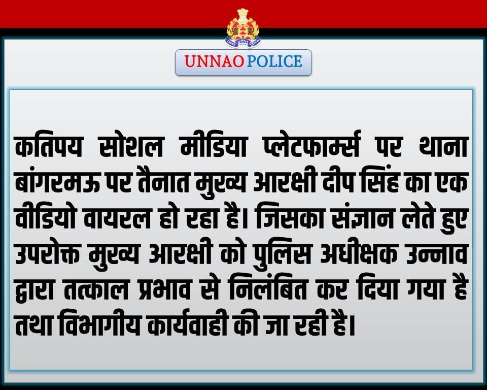 उन्नाव पुलिस के ट्वीट के मुताबिक, 'कतिपय सोशल मीडिया प्लेटफार्म्स पर थाना बांगरमऊ पर तैनात मुख्य आरक्षी दीप सिंह का एक वीडियो वायरल हो रहा है, जिसका संज्ञान लेते हुए उपरोक्त मुख्य आरक्षी को पुलिस अधीक्षक उन्नाव ने तत्काल प्रभाव से निलंबित कर दिया है और विभागीय कार्रवाई की जा रही है.'