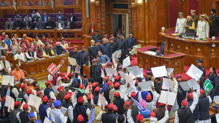 राज्यपाल जैसे ही सदन के भीतर अभिभाषण के लिए दाखिल हुए तभी विपक्षी सदस्यों ने हंगामा शुरू कर दिया. सपा-बसपा के विधायकों ने 'राज्यपाल वापस जाओ' के नारे लगाये और उनकी तरफ कागज के गोले फेंके. हंगामे के बीच राज्यपाल ने करीब 55 मिनट में पूरा अभिभाषण पढ़ा और प्रदेश सरकार की योजनाओं और उपलब्धियों का सिलसिलेवार ब्यौरा पेश किया.