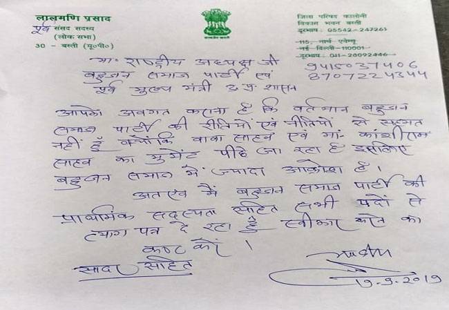 उत्तर प्रदेश की बस्ती लोकसभा सीट से बहुजन समाज पार्टी के पूर्व सांसद लालमणि प्रसाद ने गुरुवार को पार्टी छोड़ने का ऐलान कर दिया है. लालमणि ने अपना इस्तीफा बसपा अध्यक्ष मायावती को भेज दिया है. माना जा रहा है कि शुक्रवार को दोपहर में अखिलेश यादव की मौजूदगी में समाजवादी पार्टी का दामन थामेंगे. ऐसे में बसपा के लिए यह करारा झटका माना जा रहा है.