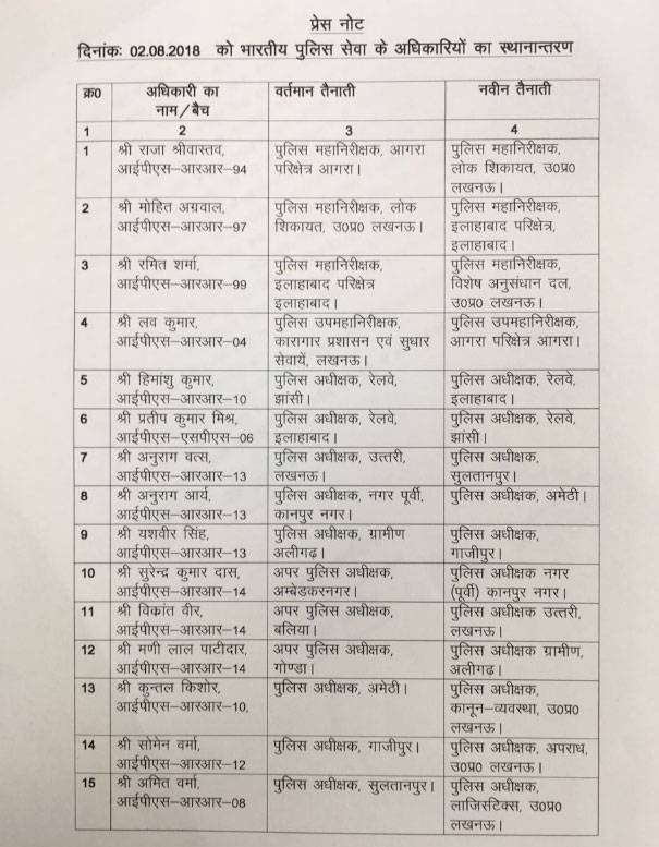 वहीं, प्रतीप कुमार मिश्रा को झांसी रेलवे का एसपी बनाकर भेजा गया है, जबकि अनुराग आर्य को अमेठी का एसपी बनाया गया है. यशवीर सिंह को गाजीपुर का एसपी, सुरेंद्र कुमार दास को सिटी कानपुर के एसपी, विक्रांत वीर को उत्तरी लखनऊ का एसपी, मणिलाल पाटीदार को ग्रामीण अलीगढ़ का एसपी, कुंतल किशोर को लखनऊ एसपी कानून व्यवस्था और सोमेन वर्मा को लखनऊ एसपी क्राइम बनाया गया है.