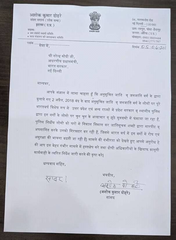 पीएम मोदी से की गई शिकायत में सांसद अशोक दोहरे ने कहा कि भारत बंद के बाद दलित और अनुसूचित जाति के लोगों को यूपी समेत दूसरे राज्यों में प्रदेश सरकार व स्थानीय पुलिस झूठे मुकदमें में फंसा रही है. दलितों पर अत्याचार हो रहे हैं. उन्होंने कहा, पुलिस निर्दोष लोगों को जातिसूचक शब्दों का इस्तेमाल करते हुए घरों से निकालकर मार रही है.