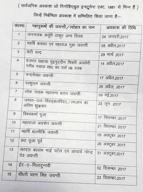 जिन अवकाशों को योगी सरकार ने रद्द किया है, उनमें जन नायक कर्पूरी ठाकुर जयंती 24 जनवरी, ख्वाजा मोइनुददीन चिश्ती अजमेरी गरीब नवाज उर्स 14 अप्रैल, चंद्रशेखर का जन्मदिन 17 अप्रैल, परशुराम जयंती 28 अप्रैल, महाराणा प्रताप जयंती नौ मई, छठ पूजा 26 अक्टूबर आदि शामिल हैं.