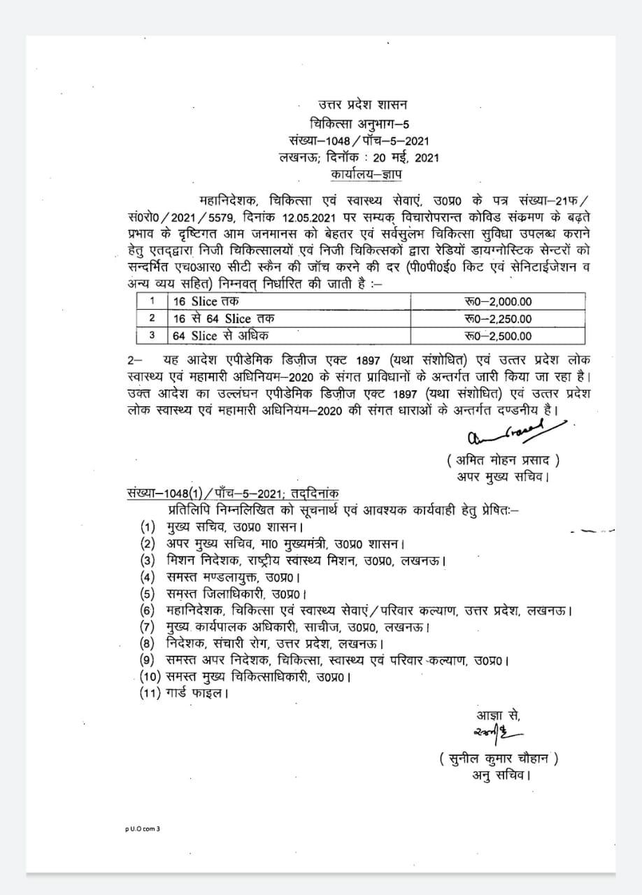 उत्तर प्रदेश में कोरोना संकट के बीच राज्य की योगी सरकार ने सीटी स्कैन के रेट तय कर दिए हैं. सरकार की ओर से शुक्रवार को जारी किये गए एक आदेश के मुताबिक अब सीटी स्कैन के लिए हॉस्पिटल 2500 से ज्यादा रुपए नहीं ले सकेंगे.