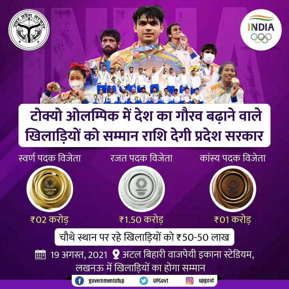 साथ ही उत्तर प्रदेश के खिलाड़ियों को भी 25-25 लाख की सम्मान राशि के साथ कुल 42 करोड़ की पुरस्कार राशि यूपी सरकार की ओर से दी गई है.