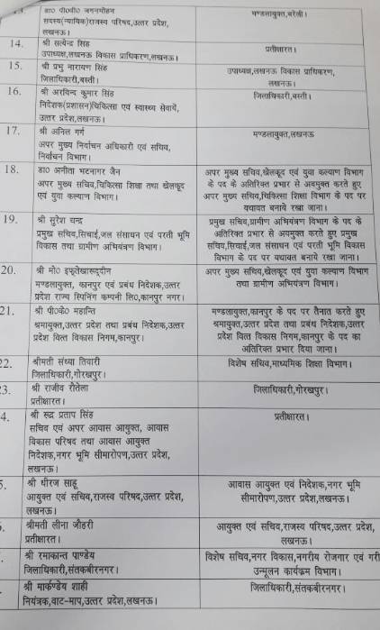 इस बार भी योगी सरकार ने कई अधिकारियों को बड़ी जिम्मेदारियां सौंपी, तो कई के पर काटे. पहले फेरबदल के तहत मृत्युंजय कुमार नारायण को मुख्यमंत्री का सचिव बनाया गया, जबकि नवनीत सहगल को सूचना एवं पर्यटन सचिव पद से हटाकर उनका प्रभार अविनाश अवस्थी को सौंप दिया गया. वहीं, अनीता मेश्राम को बाल विकास एवं पुष्टाहार विभाग का सचिव और आरपी सिह को प्रमुख सचिव खनन बनाया गया. इसके अलावा पिछली सरकार में चहेते रहे रमा रमण को नोएडा विकास प्राधिकरण के प्रमुख सचिव पद से हटाकर उनकी जगह आलोक सिन्हा को प्रभार सौंपा गया.