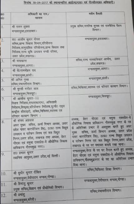 उत्तर प्रदेश की योगी आदित्यनाथ सरकार ने सूबे के 41 आईएएस अधिकारियों के तबादले कर दिए हैं. यूपी में बीजेपी की सरकार बनने के बाद योगी सरकार का दूसरा सबसे बड़ा फेरबदल है. इस फेरबदल के तहत योगेश शुक्ला को राज्य संपत्ति अधिकारी बनाया गया है, जबकि राजीव रौतेला को गोरखपुर का जिला अधिकारी बनाया गया है. इसके अलावा आशीष गोयल को इलाहाबाद कगा कमिश्नर बनाया गया है. इससे पहले उत्तर प्रदेश की योगी सरकार ने प्रशासनिक महकमें में बड़ा फेरबदल करते हुए 20 आईएएस अधिकारियों के तबादले कर दिए थे.
