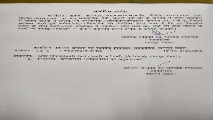 उक्त आदेश के मुताबिक कानपुर देहात के सर्किट हाउस में ठहरने वाले मंत्री मुकुट बिहारी वर्मा को नाश्ता और दोपहर का भोजन परोसने के लिए अफसरों समेत 10 सरकारी कर्मचारियों को तैनात किया गया था. यह आदेश 4 मई 2018 का है, जो कि वायरल हो रहा है.