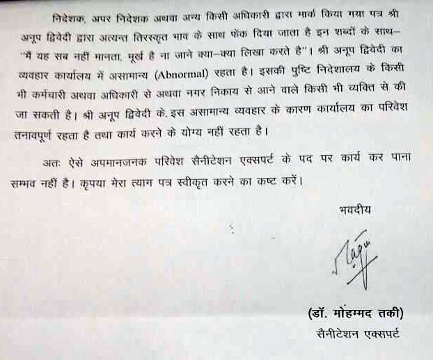 राज्य मिशन निदेशक को लिखे पत्र में मो. तकी ने डोर टू डोर कलेक्शन और शौचालय के निर्माण के डाटा का काम देखने वाले अनूप द्विवेदी पर प्रताड़ना का आरोप लगाया है. तकी ने इस्तीफा देने के कारणों में ऑफिस के खराब माहौल को भी ठहराया है.