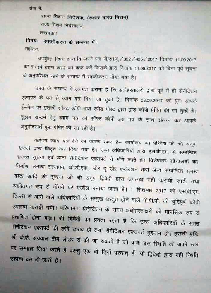 उन्होंने लिखा है कि शौचालय के निर्माण, उनका सत्यापन, ओ. डी. एफ, डोर टू डोर कलेक्शन और अन्य संबंधित समस्त डाटा की सूचना अनूप द्विवेदी की ओर से उपलब्ध नहीं कराया जाता है. और मांगने पर मखौल उड़ाया जाता है.