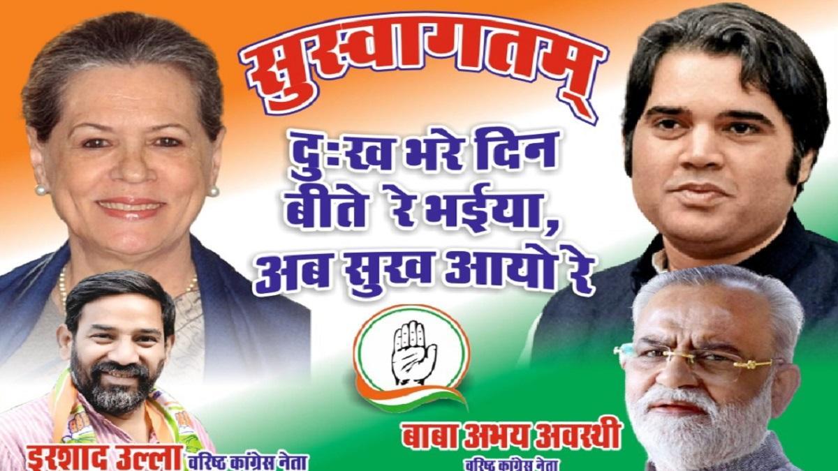 वरुण गांधी के स्वागत पोस्टर में लिखा है, 'दुःख भरे दिन बीते रे भइया अब सुख आयो रे.' इसमें वरुण गांधी के साथ-साथ कांग्रेस अध्यक्ष सोनिया गांधी का भी फोटो है. नीचे इरशाद उल्ला और बाबा अभय अवस्थी की तस्वीर लगी है. दोनों को ही कांग्रेस का वरिष्ठ नेता बताया गया है.