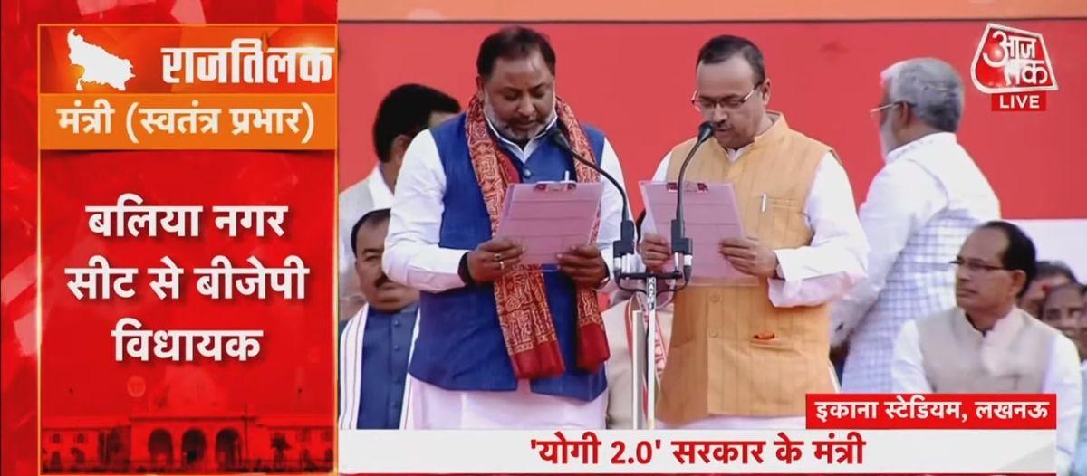 अब तक मंत्री के तौर पर सूर्य प्रताप शाही, सुरेश खन्ना, स्वतंत्र देव सिंह, बेबी रानी मौर्य शपथ ले चुके हैं. वहीं इकाना स्टेडियम में योगी सरकार में मंत्री के रूप में लक्ष्मीनारायण चौधरी शपथ ले रहे हैं.