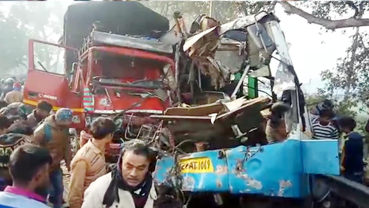 A bus and truck collided on the Moradabad-Agra highway in Uttar Pradesh. The accident happened due to low visibility in fog in which 10 people died while 25 people were injured.