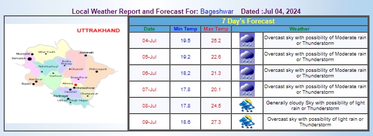 मौसम विभाग के मुताबिक, 7 जुलाई तक बागेश्वर में आसमान में बादल छाए रहेंगे और मध्यम बारिश या गरज के साथ बौछारें पड़ने की संभावना है. इसके बाद भी यहां बारिश का सिलसिला जारी रहेगा. हालांकि, बारिश की तीव्रता कम हो जाएगी. तापमान की बात करें तो यहां न्यूनतम तापमान 17 से 19 से बीच रहेगा. वहीं अधिकतम तापमान 25 से 27 के बीच रहेगा.